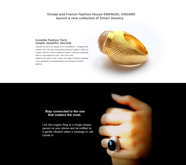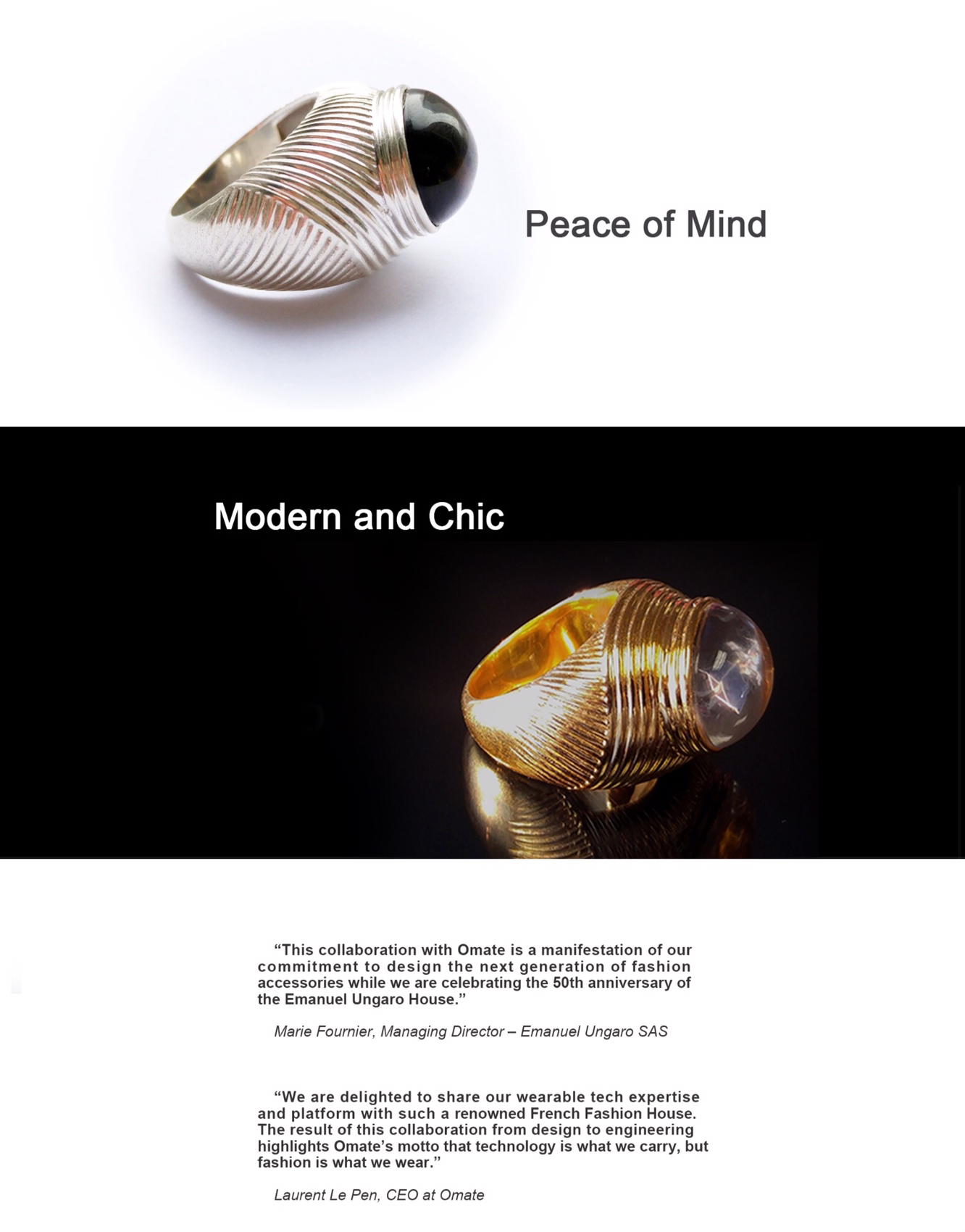 La casa de moda francesa Emanuel Ungaro junto con la compañía Omate, empresa de diseño de hardware / software, han desarrollado un anillo inteligente con un diseño exclusivo de Ungaro y con funciones Smart.